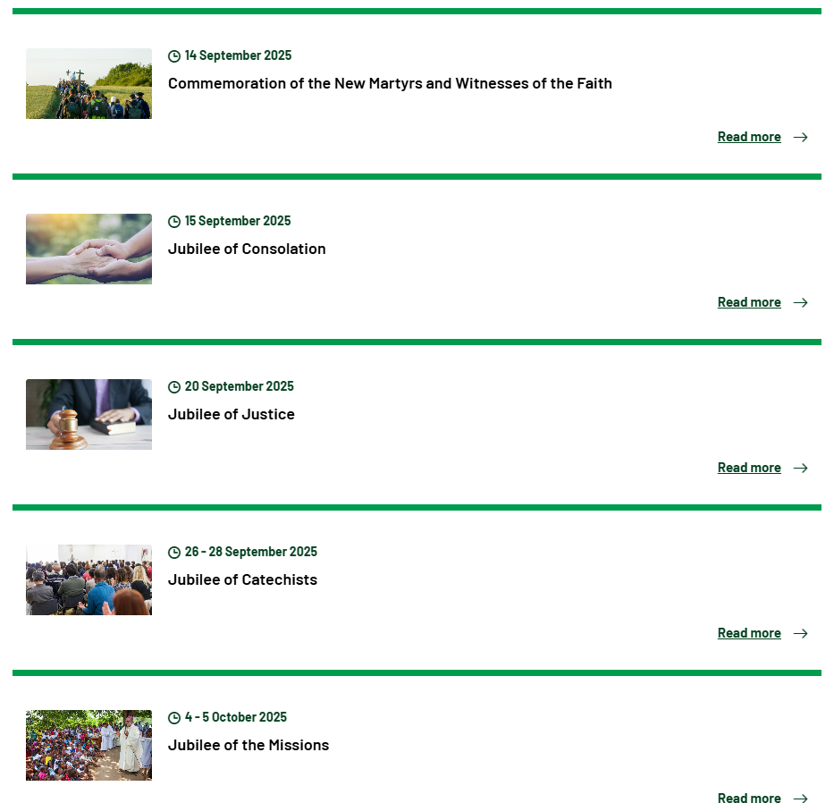The Vatican has published yearlong activities for Holy Year. Throughout 2025, individual jubilees are scheduled which includes jubilees for teenagers, children and parents, and grandparents, for musicians, health care workers, for military personnel, security and police, deacons, bishops and Eastern Churches, missionaries and those in consecrated life. See Vatican website for details. https://www.iubilaeum2025.va/en/pellegrinaggio/calendario-giubileo.html ( Jubilee 2025).