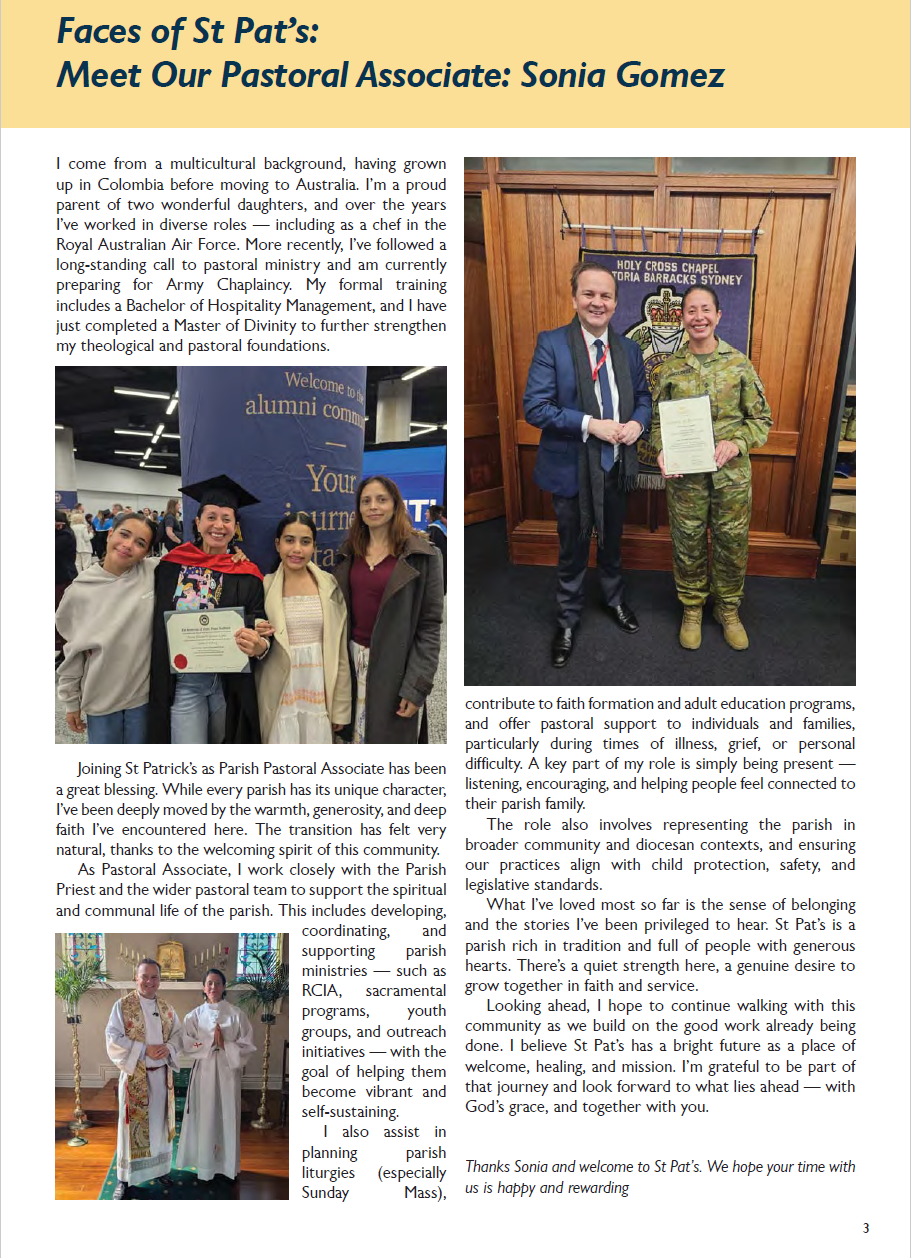 St Patrick's Parish, Mortlake, a suburb of Sydney, welcomes Sonia Gomez Lopez into their Parish for her Pastoral Care experience while she prepares to be a Pastoral Lay Associate in the Australian Army.
